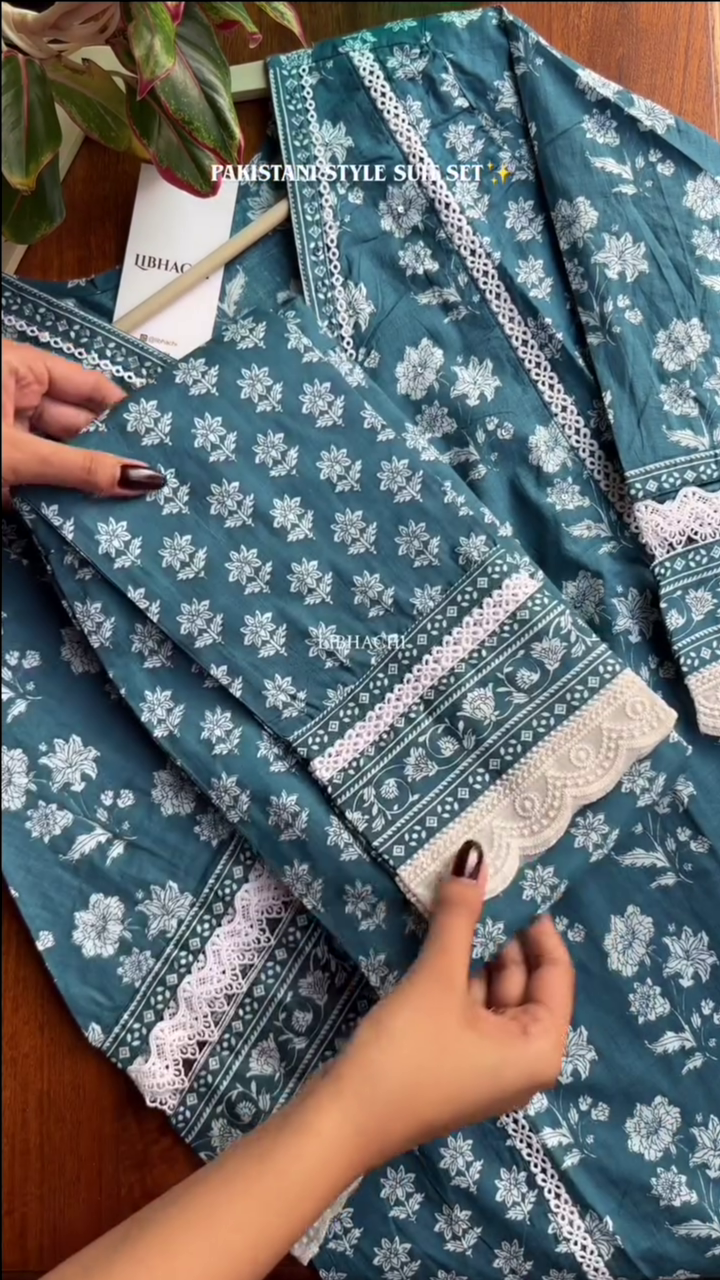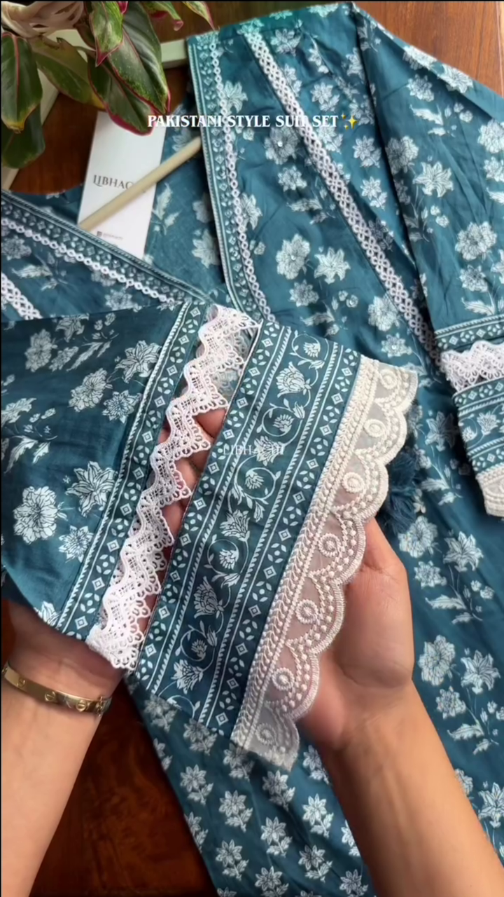 Cotton Kurta Set with Moti & Lace Embellishments – Blue