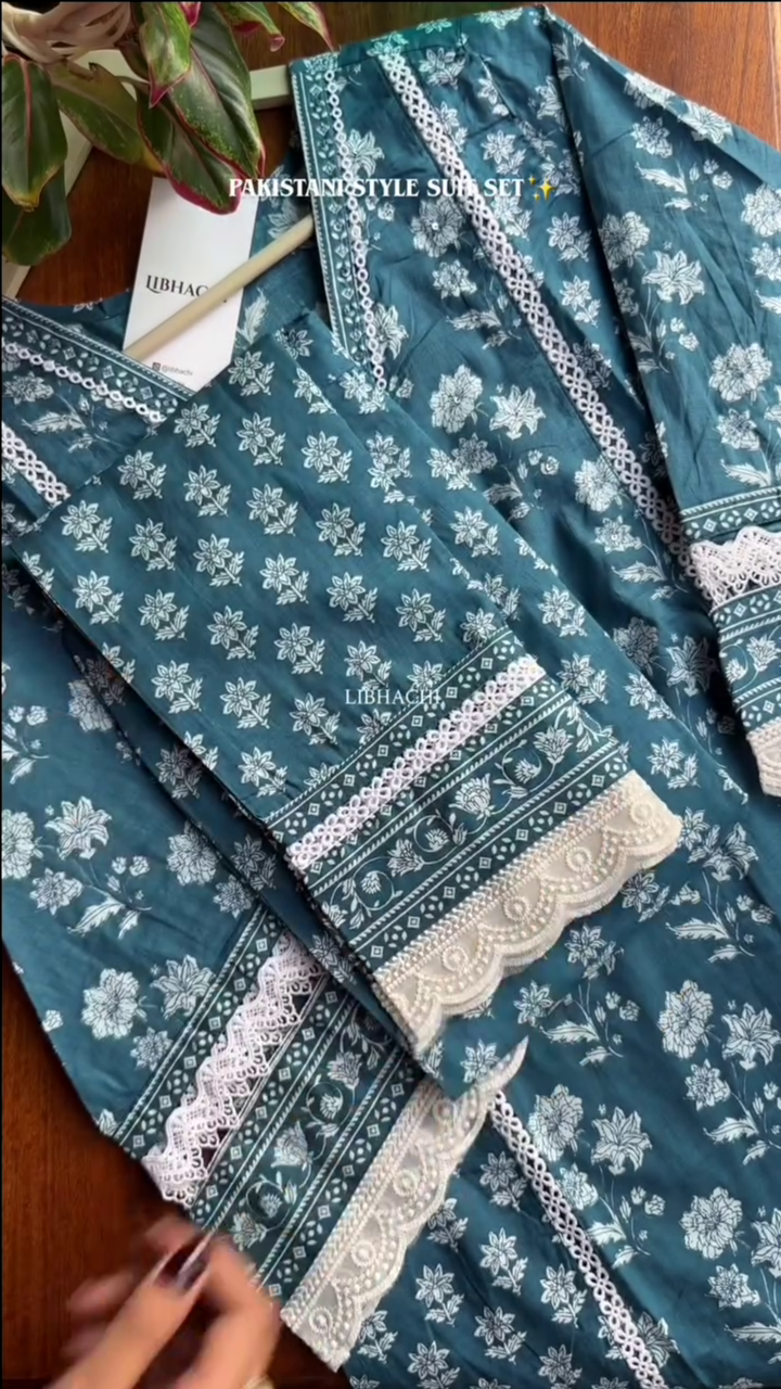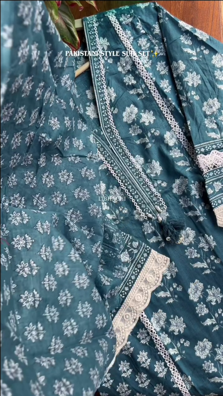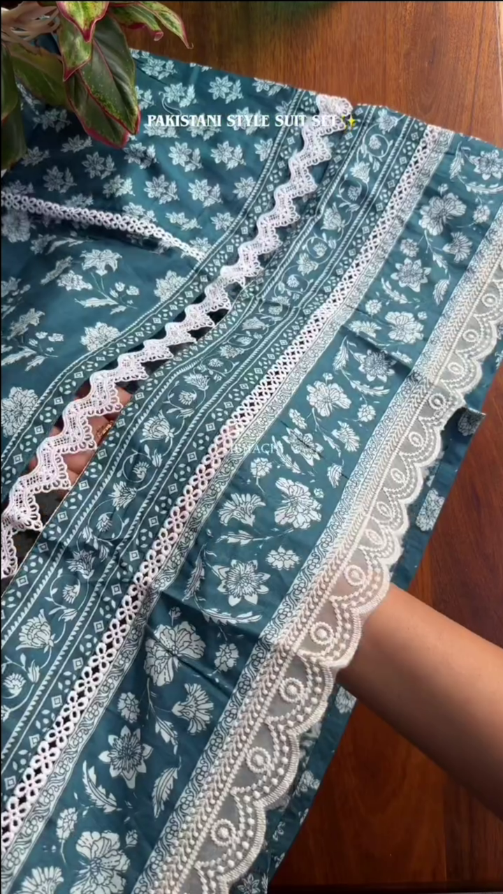 • Step into a world of timeless grace with our exquisite Cotton Kurta Set, meticulously crafted for those who appreciate the finer things in life. Elevate your style with this ensemble that seamlessly combines comfort and sophistication. Embrace the artistry of moti and lace work adorning the neckline, paired perfectly with a matching pant and a luxurious cotton malmal dupatta. Immerse yourself in the sheer opulence of this ensemble, designed to make you stand out on any occasion.