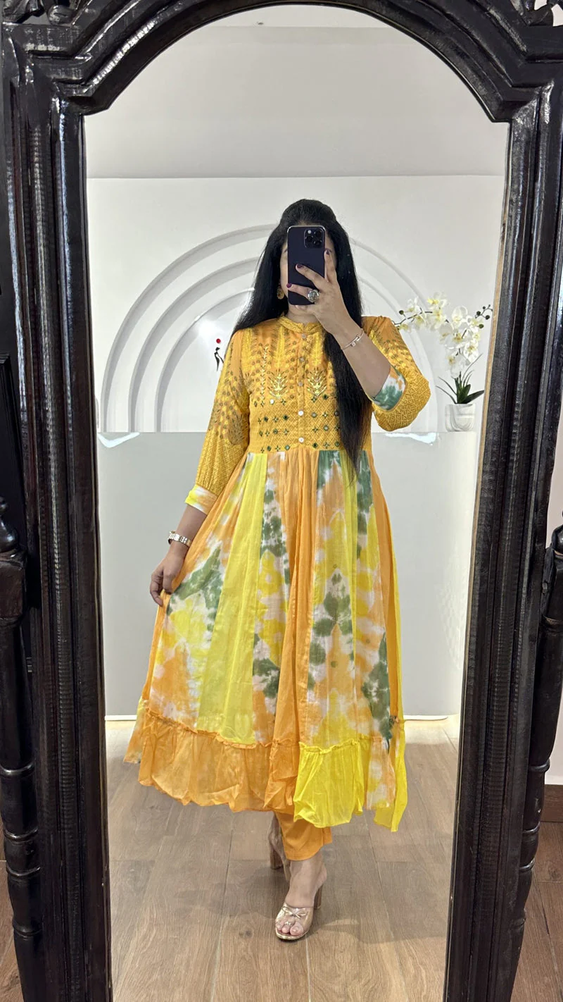 Mulmul frock with pants (straight cut cotton pants, slim fit), has embroidery work on the yoke and comes with fully openable buttons (feeding friendly). Has center slit from the yoke.